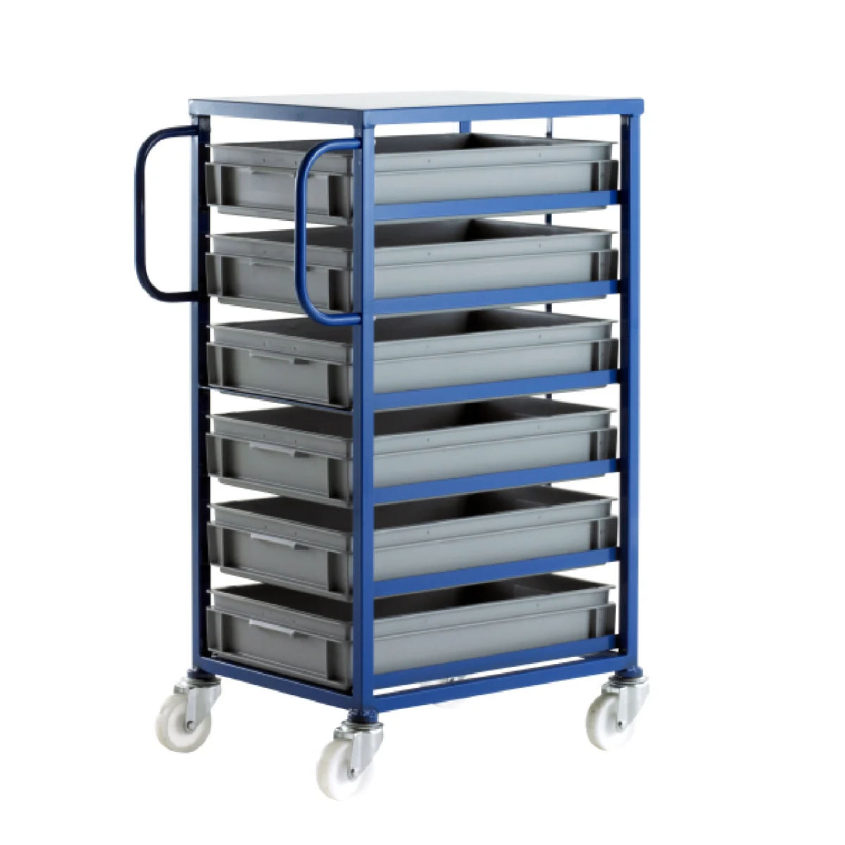 Organise small parts on the move with the Loadtek 200 Series Mobile Tray Rack โ a Britishโmade welded steel unit rated to 200kg and supplied complete with 6 x 600 x 400mm Euro containers (PC005). Finished in blue epoxy, it runs on 100mm swivel castors with Total Stop Brakes included, while a rear metal strap prevents trays pushing through during loading.