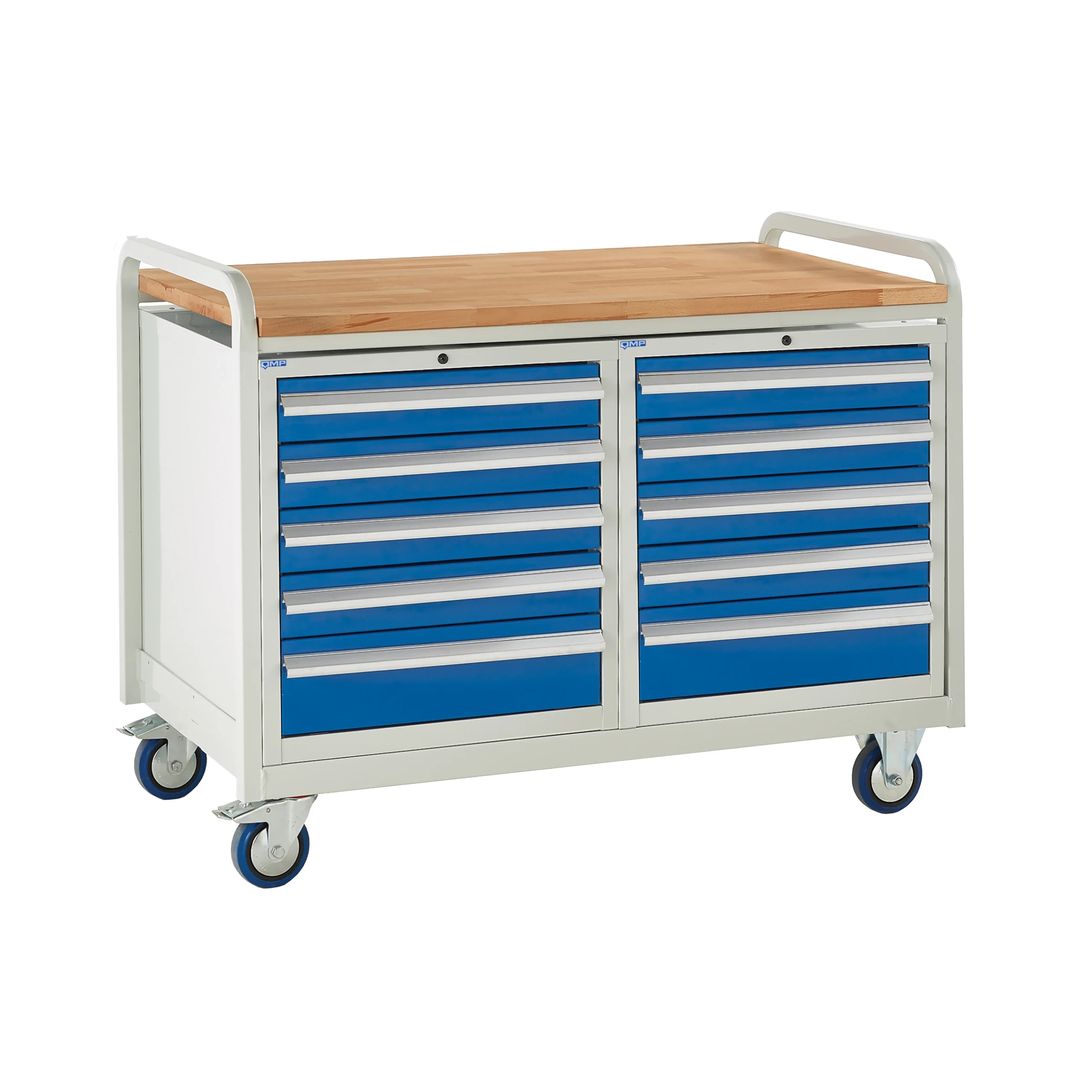 This massive double-width mobile workstation features 10 heavy-duty drawers, providing exceptional storage capacity for substantial tool collections in industrial settings. Built on a rugged steel chassis with smooth-rolling castors, it functions as a complete, portable maintenance hub that moves with your workflow.