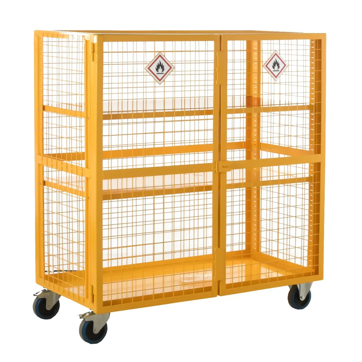 Secure, move and store hazardous goods with our Britishโmade Loadtek Hazardous Boxtek Trolley. The 4โsided mesh body with lockable security doors, solid steel top and base, plus two adjustable plywood shelves (100kg each) delivers safe, organised handling up to 500kg total. Finished in hiโvis yellow with warning labels and fitted with 2 swivel braked + 2 fixed heavyโduty Resilex castors, in six size options.