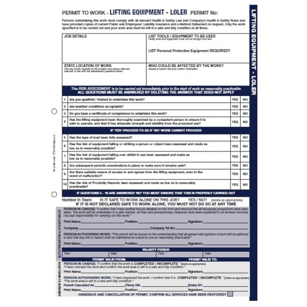 A 50-permit A4 self-duplicating pad for managing lifting operations, confirming competence, equipment checks, and safe systems with clear authorisation and records.