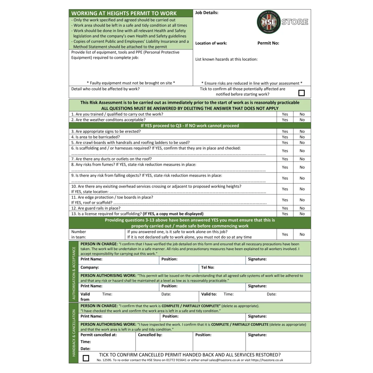 Our Permit To Work – Working at Height (Pad of 50) is a professional A4, triplicate NCR pad that helps control ladder, scaffold, roof and MEWP tasks through clear risk checks, authorisations and hand‑back, so height work is properly planned, supervised and carried out by competent people. Each pad provides 50 permits glued at the head with a rigid board back, producing an original and two duplicates; the back copy is card with a temporary warning sign for on‑site display to increase visibility while work is in progress.