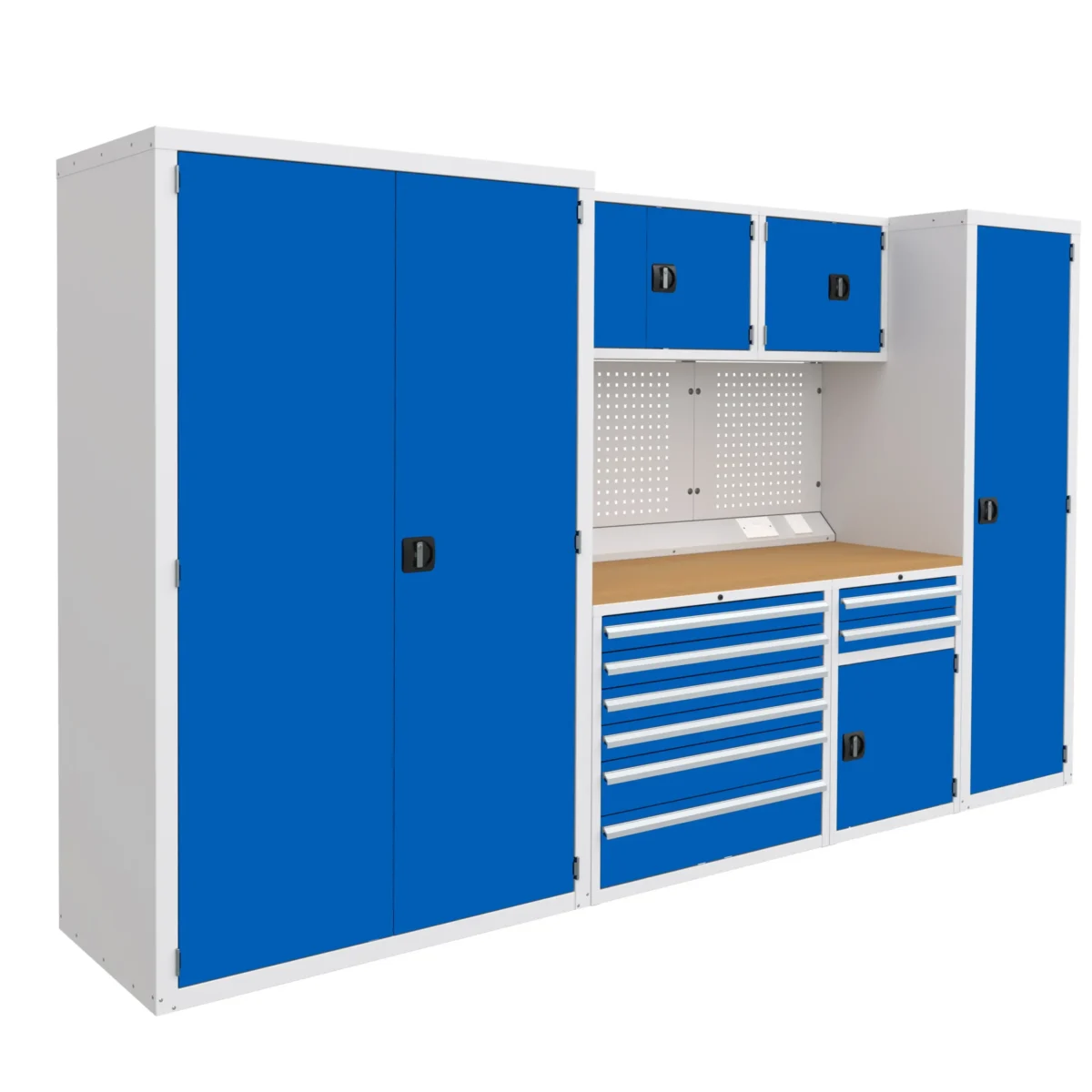 Kit E is engineered for those who demand more from their workspace. It features two tall storage cupboards, a drawer-and-cupboard combo, a spacious 6-drawer cabinet, and overhead compartments – all tied together by a heavy-duty worktop and smart tool panel system. Designed for durability and long-term use, it’s ideal for professionals working in engineering, automotive, and technical industries.