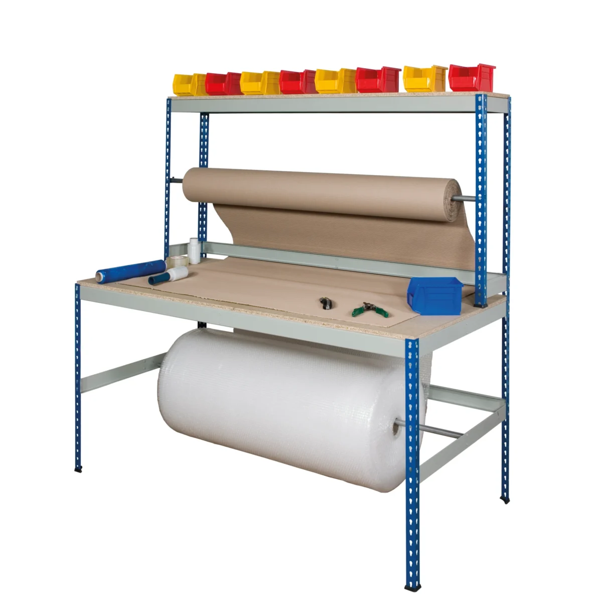 To enhance functionality, the Rivet Packing Workstation is equipped with two metal tube packaging roll dispensers, perfect for holding cardboard, bubble wrap, or other packing materials. These dispensers allow for quick and convenient access to packaging rolls, making the packing process more efficient and reducing downtime. This workstation is ideal for factories, distribution centres, or warehouses where packaging tasks are frequent and require a reliable and organized workspace.