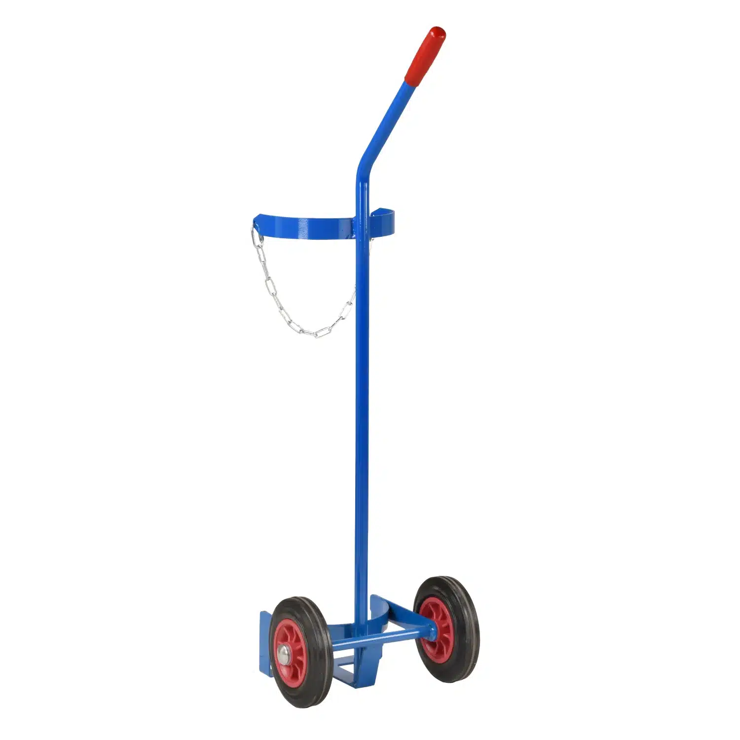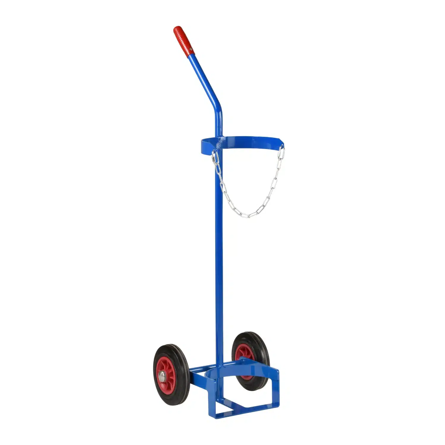 Safety is paramount when transporting compressed gases. This trolley features a sturdy framework base designed to cradle the cylinder perfectly, while a heavy-duty retention chain wraps around the upper body of the cylinder. This ensures the load remains firmly locked in a vertical position, completely preventing dangerous shifts or tipping while on the move.