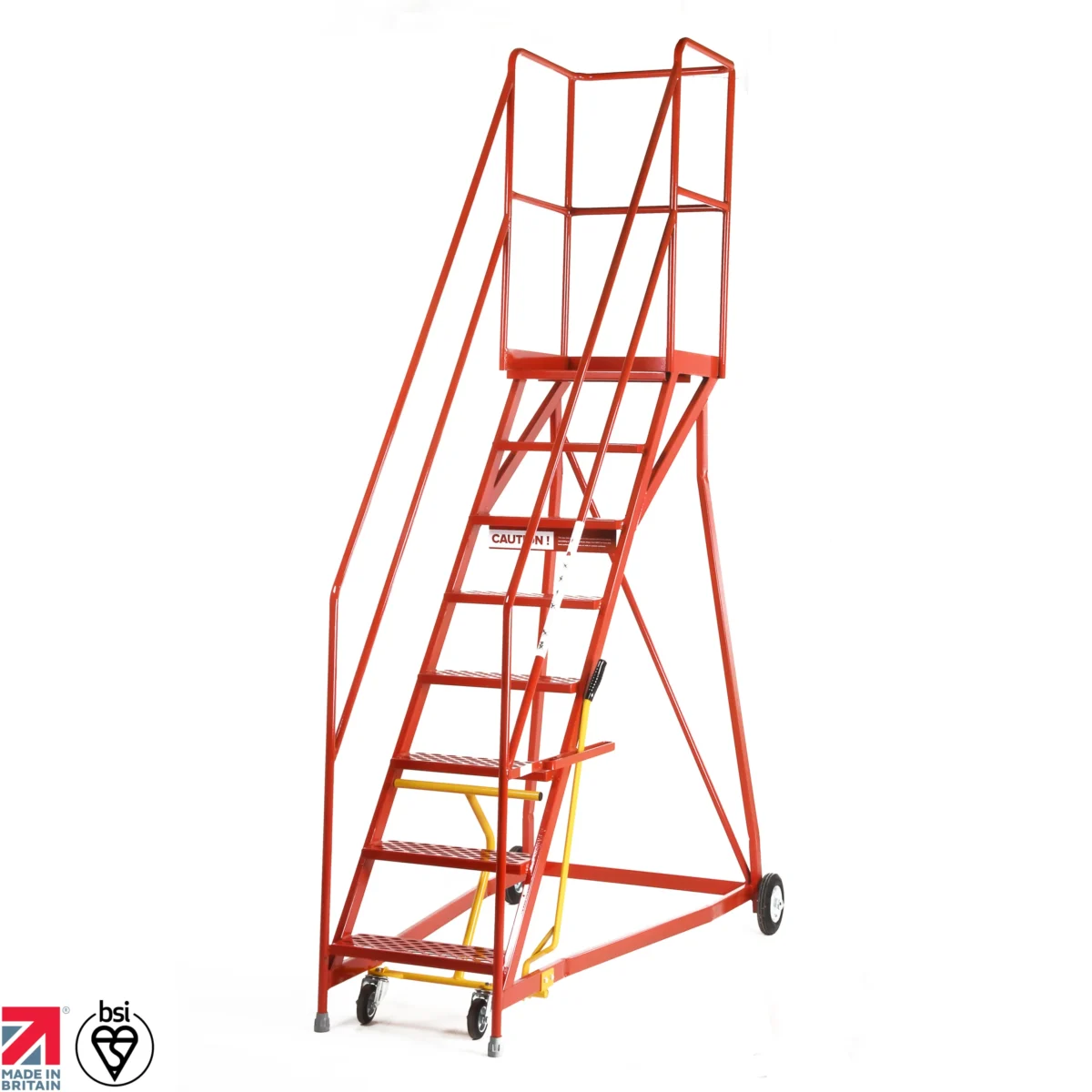 When working at extreme heights of up to 4.95m (15 treads), standard mobile steps can sometimes feel unnerving. The Steptek Heavy Duty BS Certified Range is engineered to eliminate that feeling entirely. Its defining feature is the Splayed Stability Base—the heavy gauge steel frame flares outwards at the bottom, creating a significantly wider footprint than standard straight-leg steps. Combined with outboard-mounted 200mm rear wheels , this design offers superior lateral stability that meets the strict requirements of BS EN 131-7.