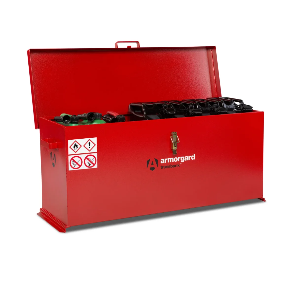 The Armorgard TransBank TRB6 is a large-capacity, COSHH-compliant transit box that safely carries up to six 20L cans, with built-in ventilation, flame arrester gauze and a 30-minute fire resistance rating for confident site or in-van use. With a fully welded sump of up to 90L, integral vehicle/floor fixing points and a padlock-ready over-centre catch, it delivers secure, spill-containment protection in a tough steel build finished in high-visibility red.