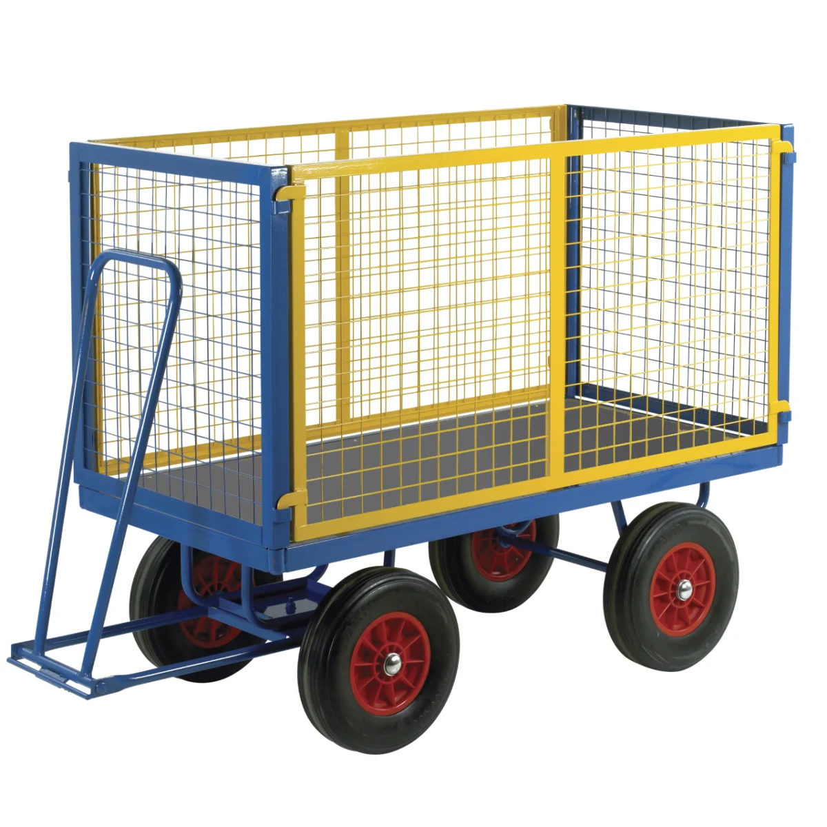 Move bulky loads securely with the Loadtek Turntable Trailer with Mesh Cage Supports — a British‑made, heavy‑duty mesh steel trailer with a solid steel deck and 760mm high drop‑down/removable sides for fast loading and safe containment. Choose from three deck sizes, pneumatic or solid rubber tyres, and loop or T‑bar steering for precise manoeuvring, all finished in durable blue & yellow epoxy.